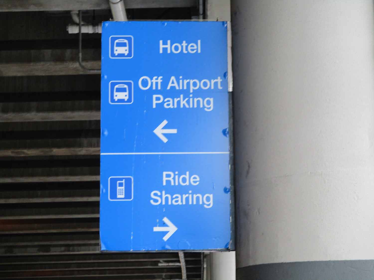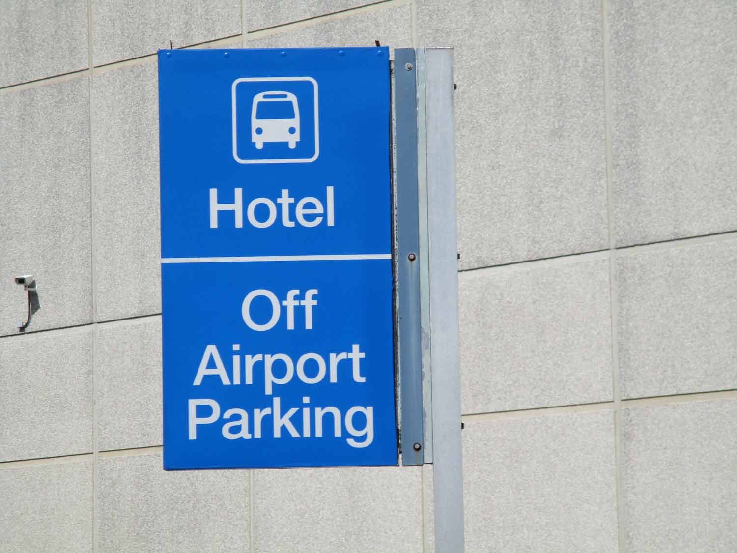 Pickup under blue sign that reads “Hotel / Off Airport Parking”